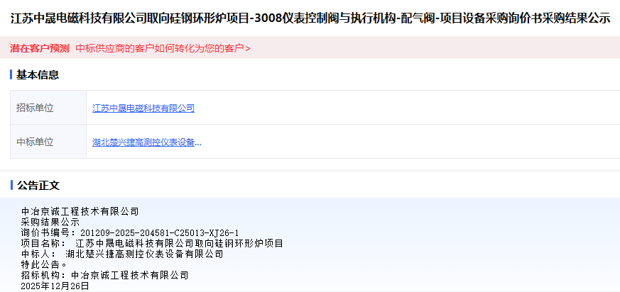 2025年12月26日 —— 公司成功中标北京京城凤凰工业炉工程技术有限公司(以下简称“京城凤凰院”)的取向硅钢环形炉配气阀项目,该设备将应用于江苏中晟电磁科技有限公司的生产线。这一重要中标标志着楚兴捷高在高端特种阀门领域的技术实力再次获得行业头部企业的认可。